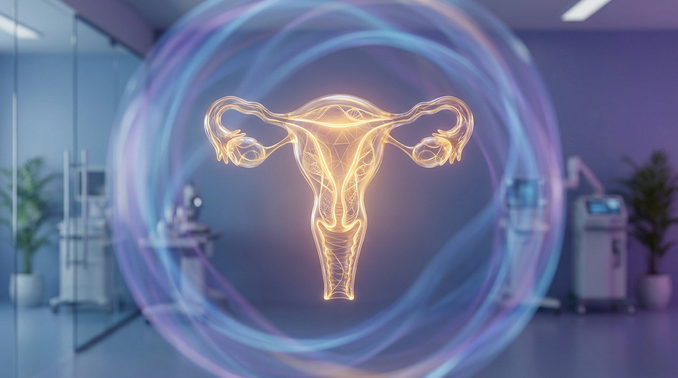 Central, glowing abstract uterus with intricate internal patterns, set in a blurred blue-purple medical lab, symbolizing hope and healing.