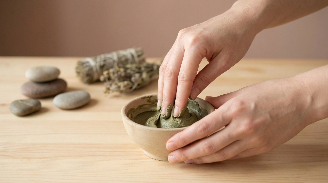 Mains mélangeant de l'argile verte dans un bol en bois sur une table claire. Pierres empilées et herbes séchées floues en arrière-plan.