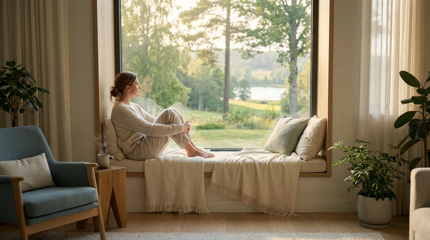 Une femme sereine est assise sur le rebord d'une fenêtre douillette, contemplant un paysage verdoyant, symbolisant le repos et la convalescence.