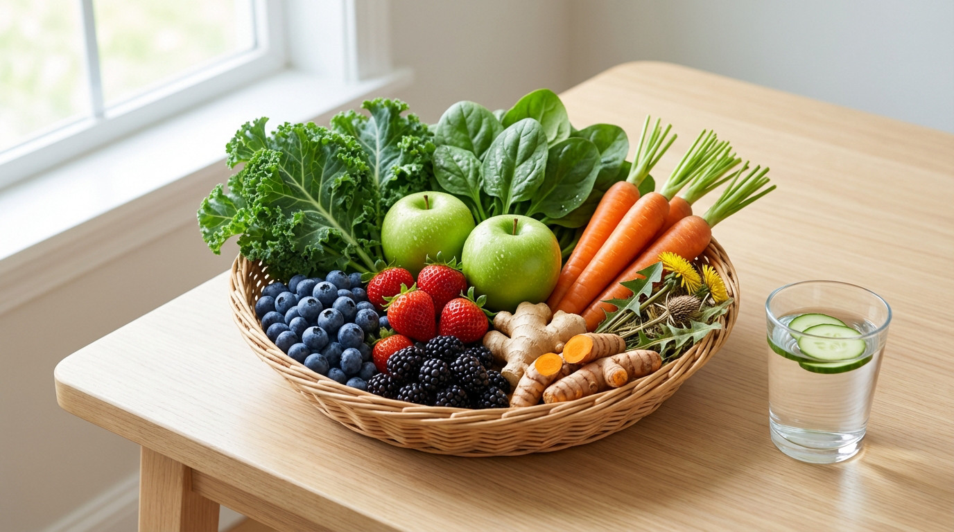 Basket of fresh kale, spinach, green apples, berries, carrots, ginger, turmeric, and herbs. Glass of cucumber water on wood table.