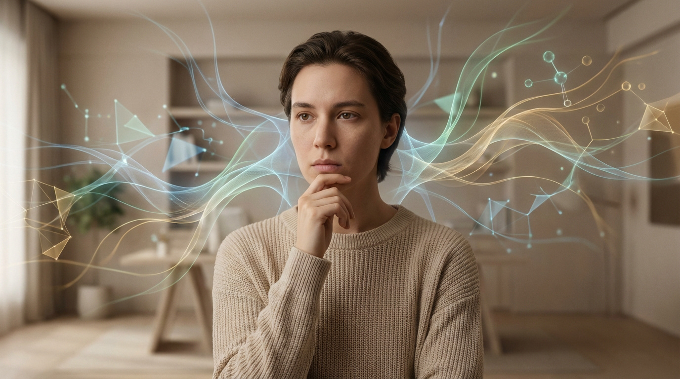 Jeune adulte pensif, main au menton, entouré d'ondes lumineuses et de formes abstraites symbolisant la compréhension médicale.